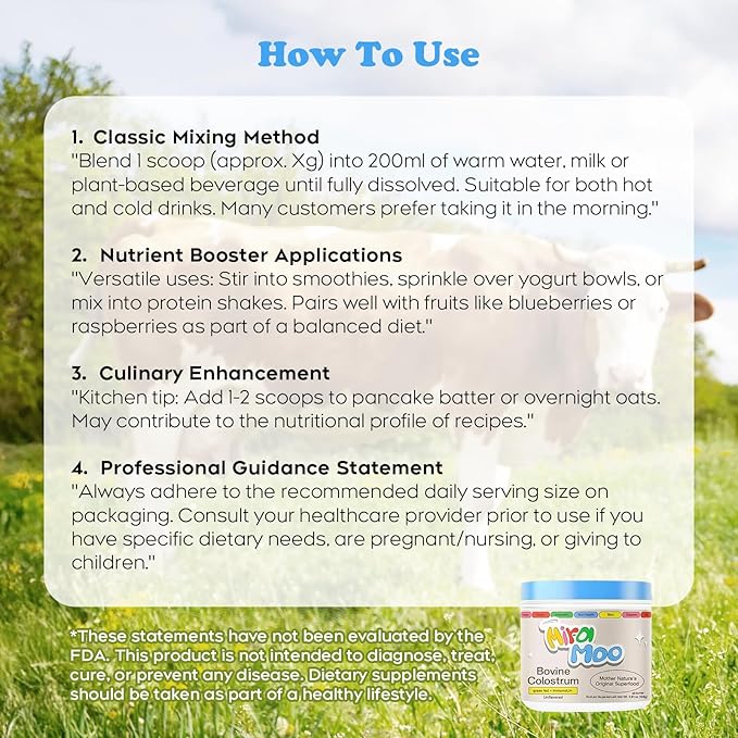 Experience the wellness of Miracle Moo Colostrum Powder, a natural powder that will boost your wellness journey, revive your immune health, and support your gut health. Elevate your health with this nutrient-rich supplement that supports tissue repair, digestion, and overall vitality.